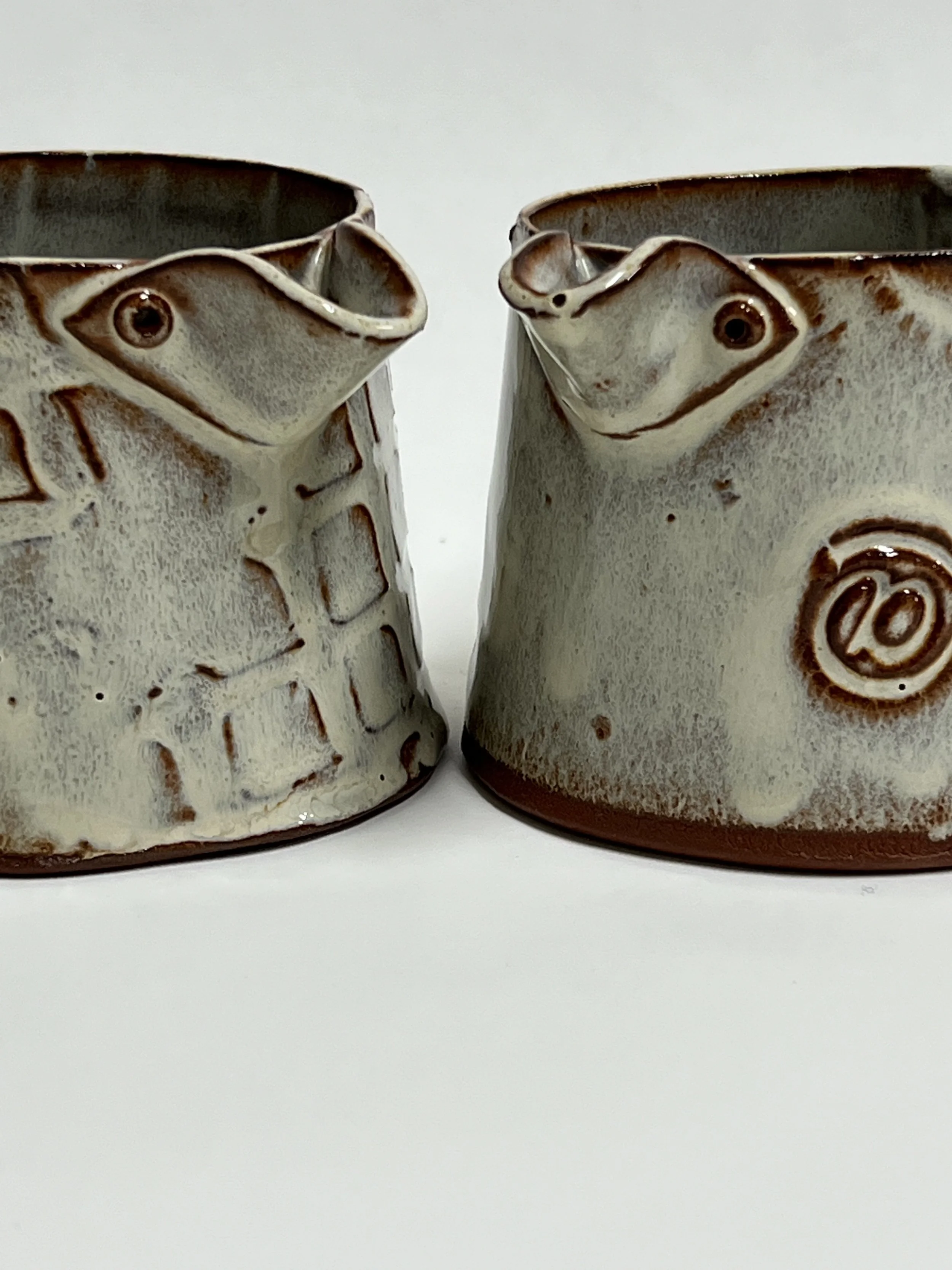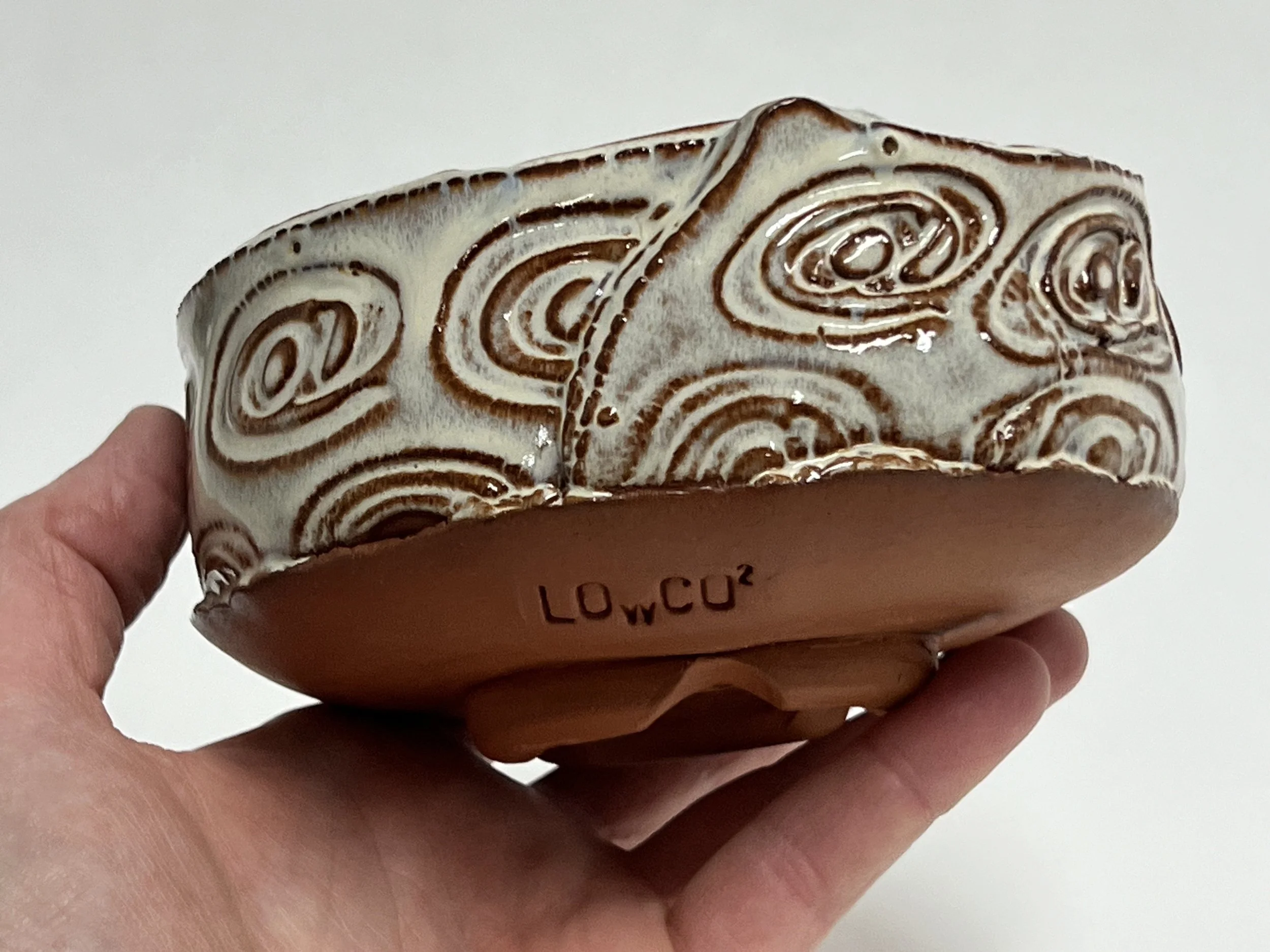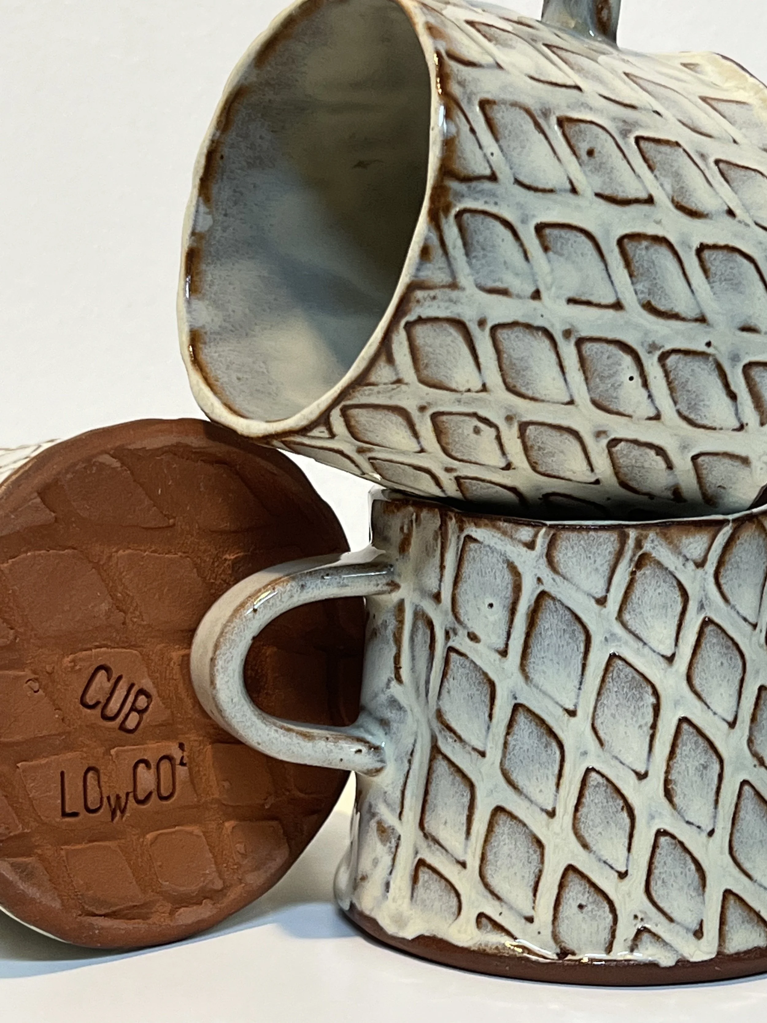 ‘LOwCO2’ mærket er din garanti for, at værket er rå-glaseret og kun brændt 1 gang. Flere af brugsværkerne er desuden fremstillet af “genbrugsler” (overskudsler eller ler-rester fra andres produktion som jeg tørrer, knuser og slemmer op igen). Jeg benytter kun få og fødevaregodkendte glasurer, hvis jeg da ikke lader leret stå råt.